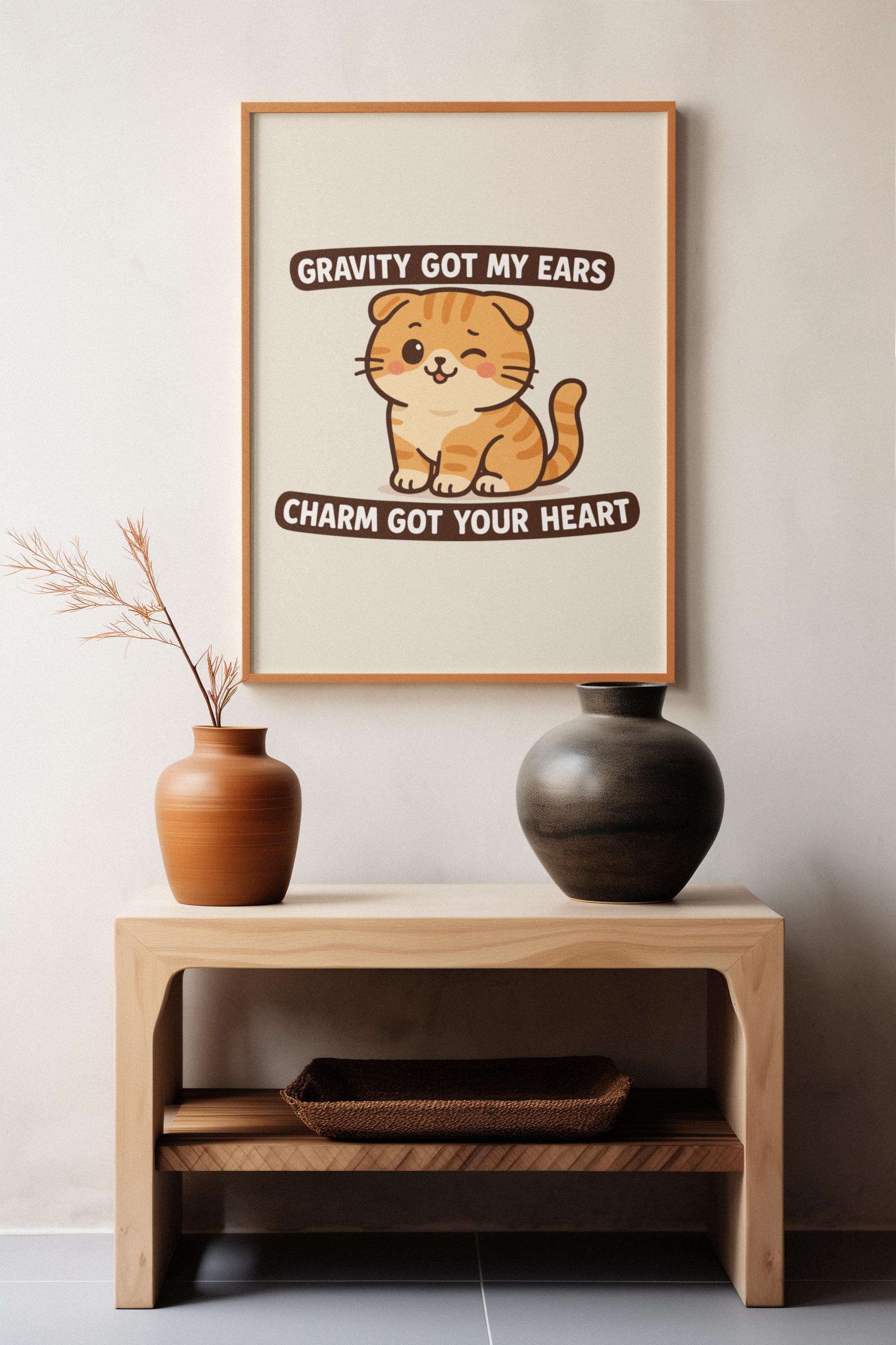 Funny Cat Memes: Adorable Cat Poster - 'Gravity Got My Ears, Charm Got Your Heart' - Cute Home Decor for Cat Lovers