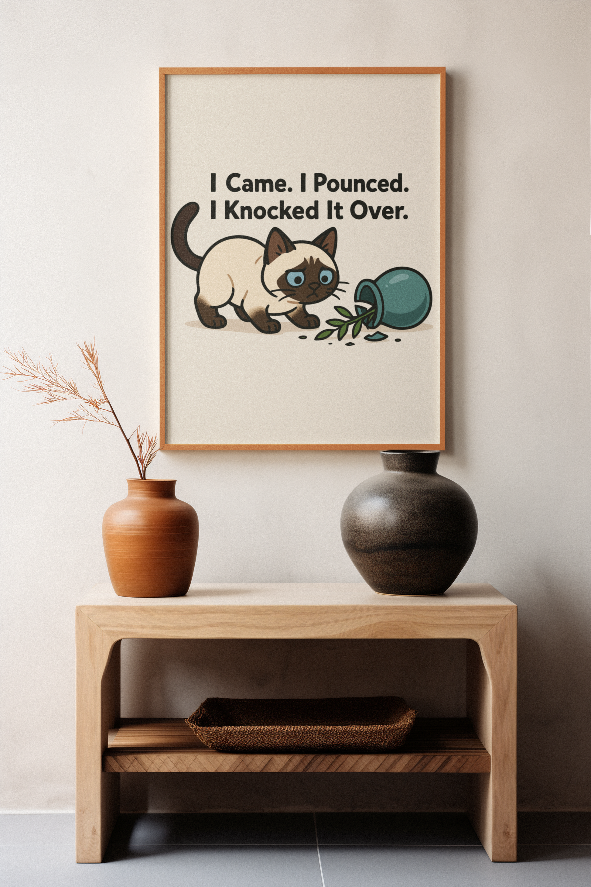 Funny Cat Memes: Whimsical Cat Wall Art Poster - 'I Came. I Pounced. I Knocked It Over.'