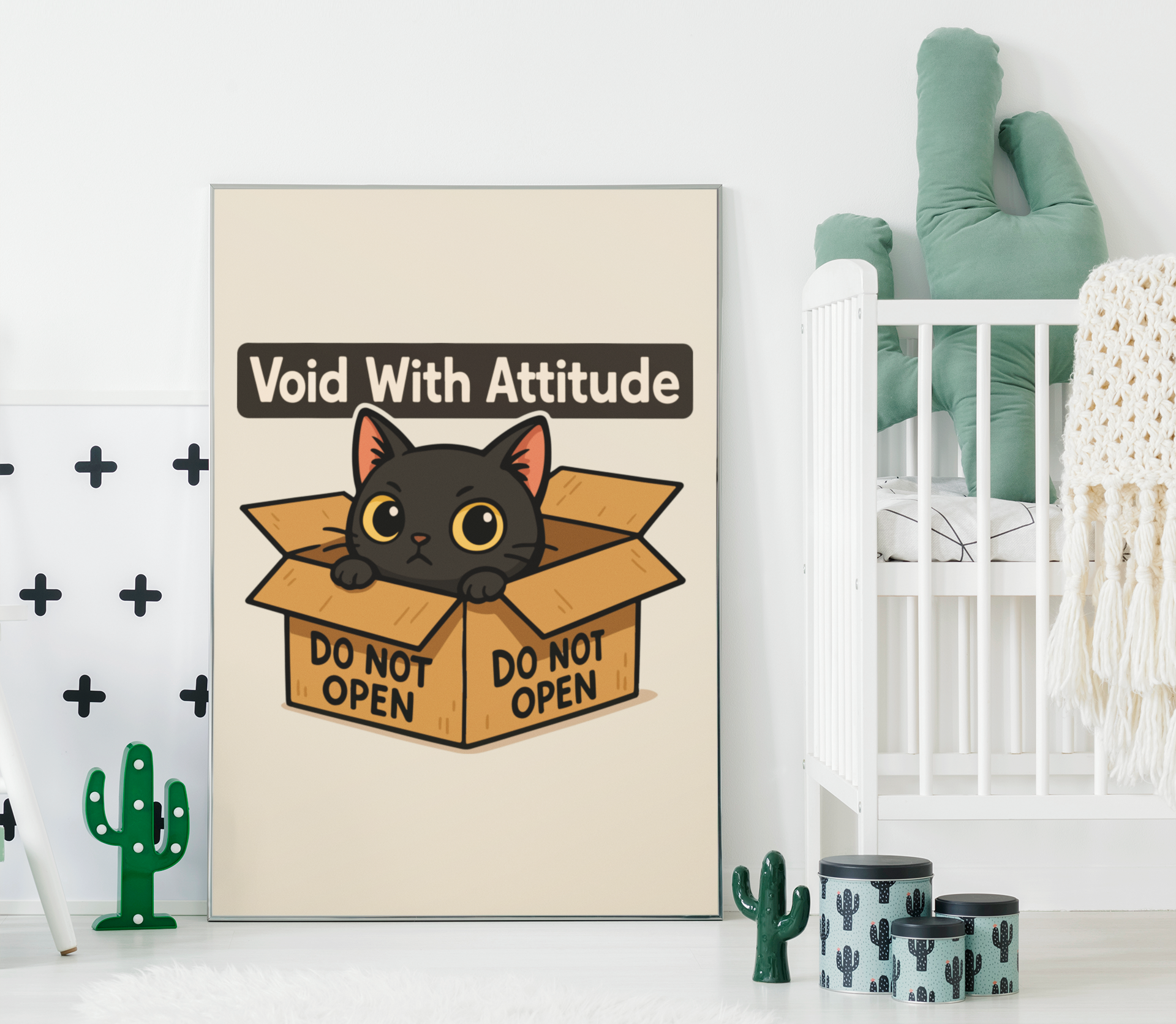 Brighten your space with this unique Matte Vertical Poster. featuring an adorable cat peeking out of a box labeled “Void With Attitude.” This charming design adds a playful touch to any room, perfect for cat lovers and anyone seeking to inject some fun into their decor. Not only does it serve as a conversation starter, but it also brings a sense of whimsy and joy to your environment. Ideal for a cozy home, office, or creative studio, it fits beautifully within home decor styles that emphasize fun and personality. Perfect for gifting on occasions like birthdays, housewarmings, or just because! Celebrate your love for cats and quirky designs with this vibrant poster that will appeal to fans of all ages.